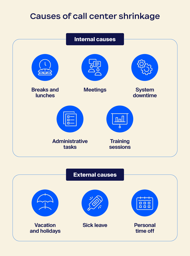 Call center shrinkage is influenced by both internal and external factors that reduce available agent time. Internal causes stem from the everyday operations and management of the call center, while external causes are often beyond immediate control.