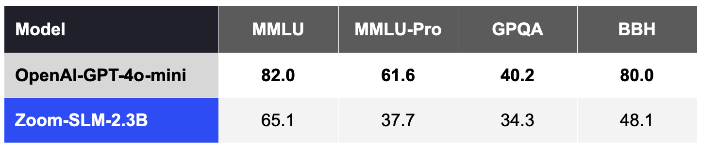 Table 2. Zoom SLM, without customization, is less competitive to LLMs beyond the 2B category, such as OpenAI GPT 4o-mini.