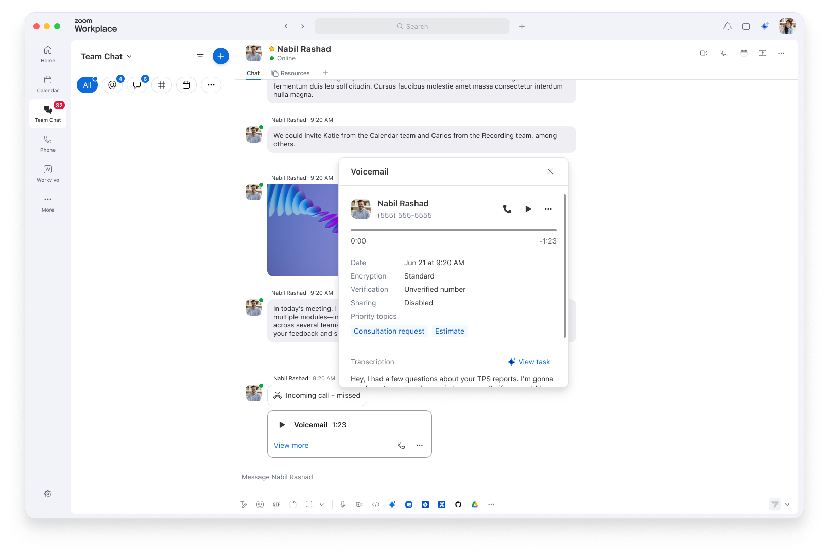 Continuous meeting chat is just one example of how Team Chat serves as a connector across Zoom, threading your interactions together in a central space. If you’re checking your email in Zoom Mail, you can easily share an important message in chat with just a few clicks. If you’re chatting with someone and want to hop on a quick call, just click the video icon to start an impromptu Zoom meeting. When you call a person from Zoom Phone or receive a voicemail from a contact, you can see call logs and voicemails in their 1:1 chat, keeping all the records of your communication in one place.