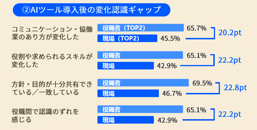 AI活用の効果実感や方針共有において、役職者と現場の間には一貫して約20ポイントの認識ギャップが存在します。