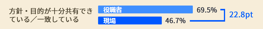 特に「方針の共有・一致」に関する差は▲22.8ポイントと最も大きく、トップダウンの意図が現場に届いていない実態が浮き彫りになりました。