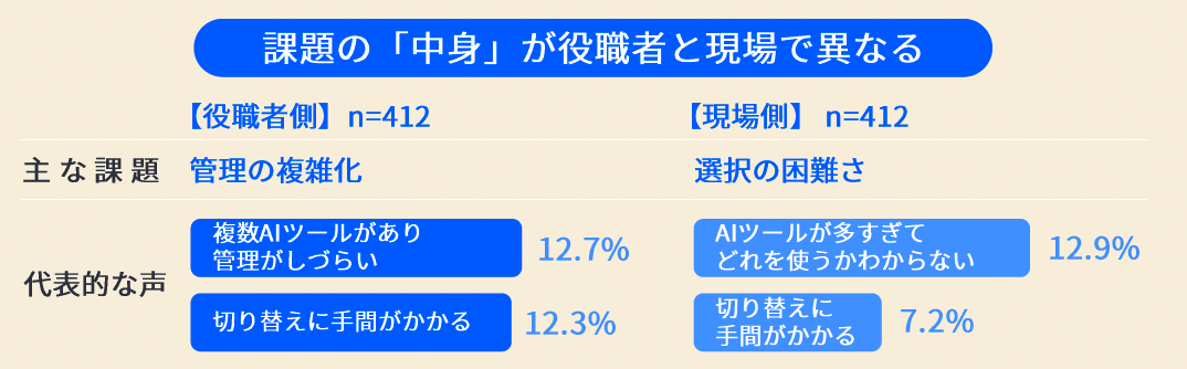調査では、複数AIツールを活用する層ほど効率化の実感が高い一方で、約2割が「管理の煩雑さ」や「選択の難しさ」を課題として挙げています。