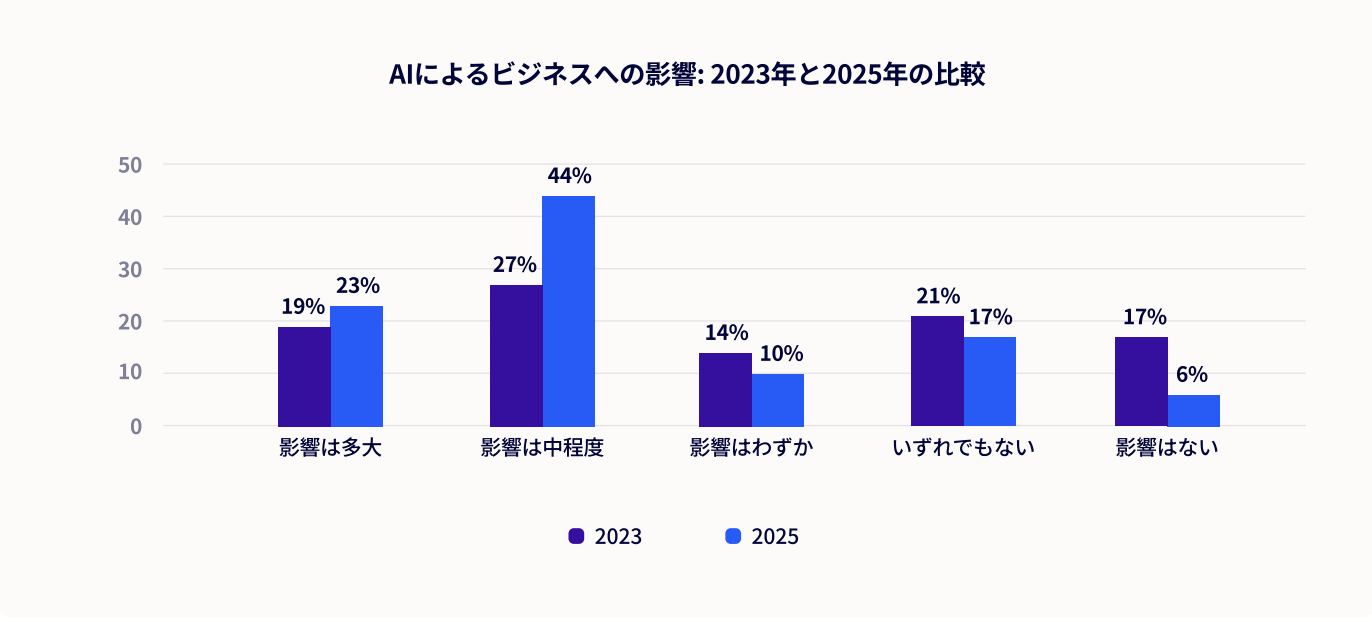 2025年の結果では、それらの数字はあまり変化していません。2025年には、SMBの77%が、すでにAIがビジネスに何らかの影響を与えていると回答しています。ただし、影響の大きさはやや過大評価されていました。2023年に回答者の28%が「今後2年間でAIはビジネスに非常に大きな影響をもたらすだろう」と回答したものの、2025年の回答者のうち「現在、AIによって多大なメリットを得てい る」と回答したのは23%のみでした。2025年では、企業の多く(44%)が、AI使用により「ある程度のメリット」が生じていると回答しています。