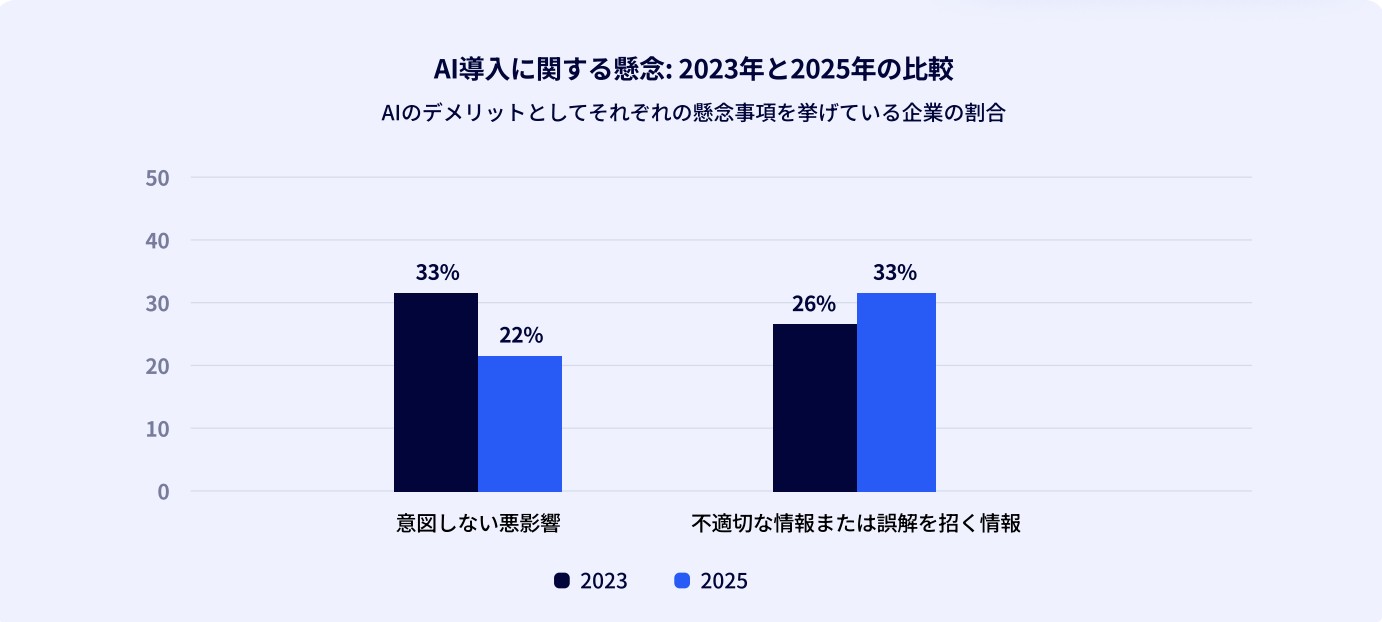 一方、不適切な情報または誤解を招く情報についての懸念は7%ポイント増加し、第2位に入りました(2023年に26%であったのに対し、2025年には33%)。企業がAIの能力と限界についての認識を高めるにつれ、AIが不正確な出力をする可能性や、AIを使用した誤情報の生成に対する懸念も高まっていることは自然な流れと言えます。興味深いことに、この状況は、AIに対する企業の信頼度レベルには影響を与えていません。
